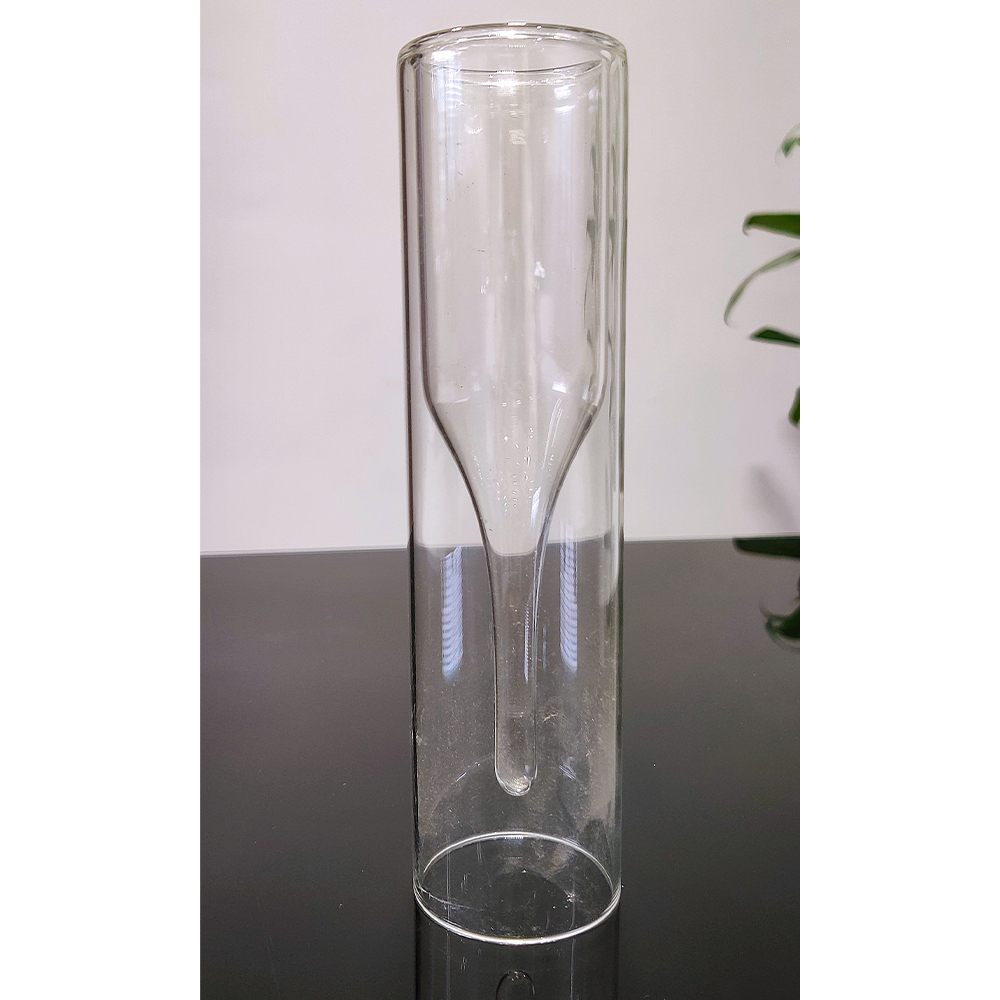 The Glass shape is sleek, long and cylindrical. The inner wall is a cylindrical bowl that curves inwards from middle to bottom forming a stem shape that also holds your liquor. Where as the outer wall of glass is straight and cylindrical. The rim of glass is wide open for easy pouring and drinking. The vertical, streamlined shape conveys a contemporary design ideal for both casual and formal settings.