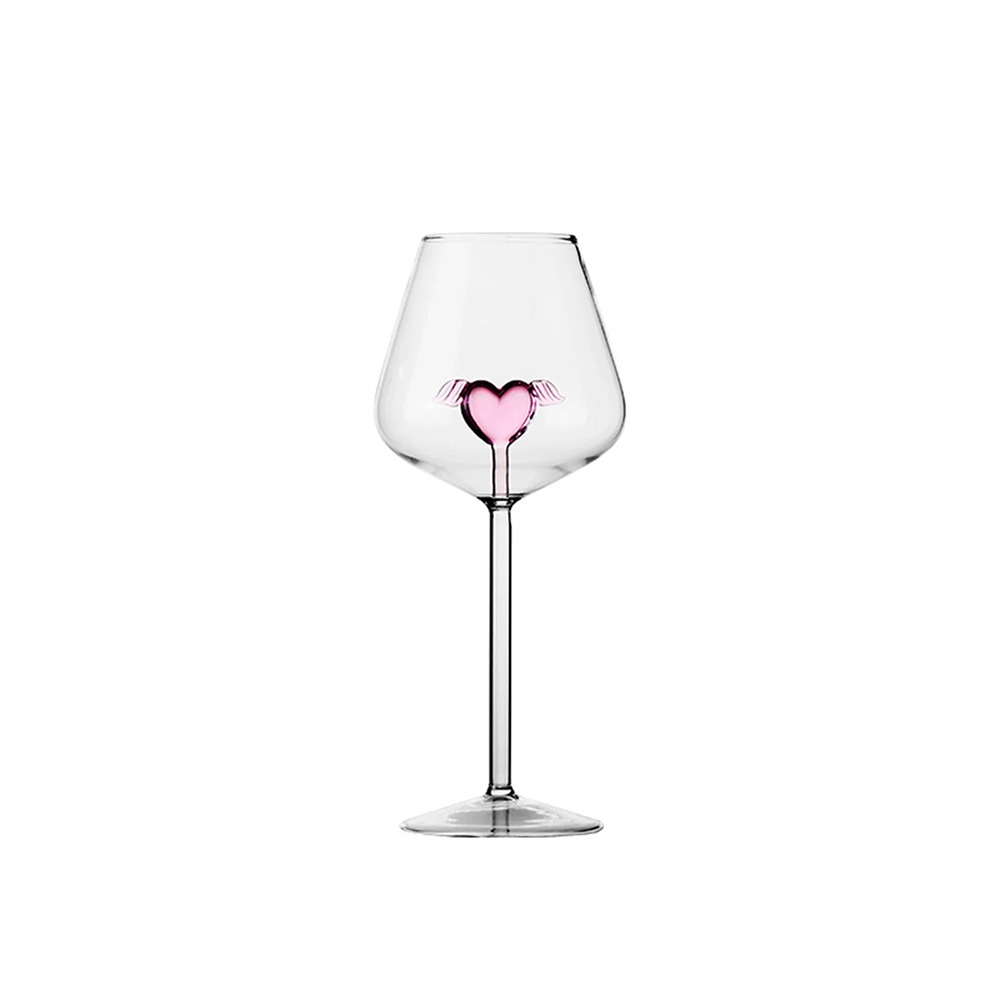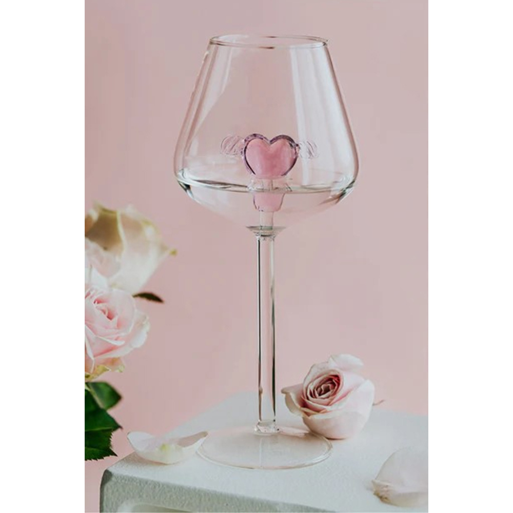 This Heart in Wine Glass is from our valentine theme collection. The glass is beautifully crafted piece made from high quality borosilicate glass, created by handblown technique. The upper body of glass is a large, wide bowl and a slightly curved, open rim where it connects to The long stem which leads down to circular base to provide stability. The highlight of the glass is the small pink glass heart in the wine glass which gives it a romantic, soft and adorable vibe.