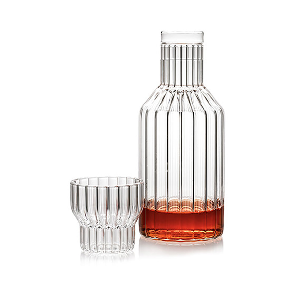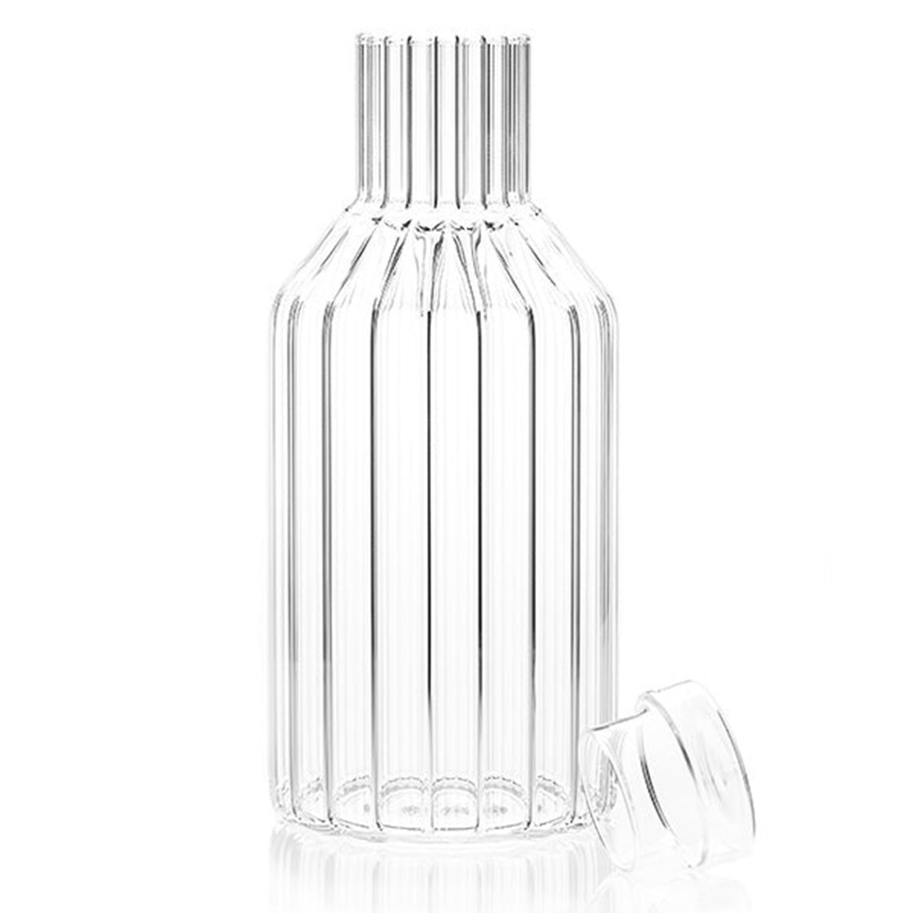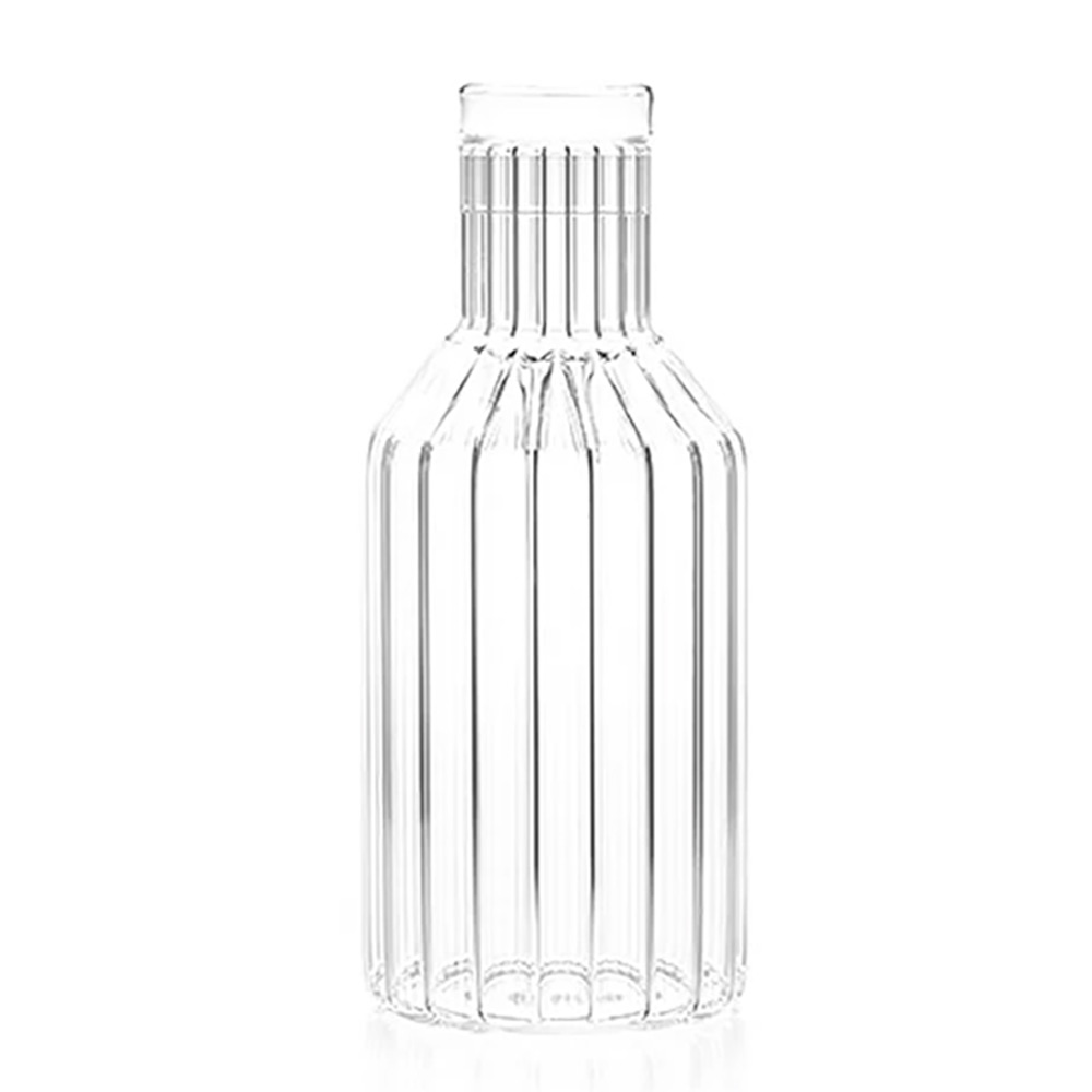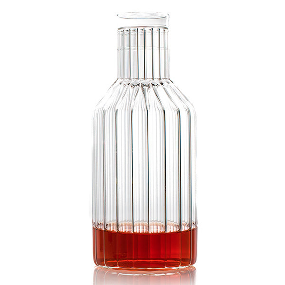 Ribbed decanter with glass cap, textured glass decanter, ribbed glassware, vintage-style decanter, luxury borosilicate glass decanter, handblown ribbed decanter, glass stopper decanter, elegant barware, designer wine decanter, sculptural drinkware, modern glass decanter, premium tabletop accessory, decorative decanter, timeless glass design, statement drinkware, home bar essential, artisan glass decanter, ribbed wine server.