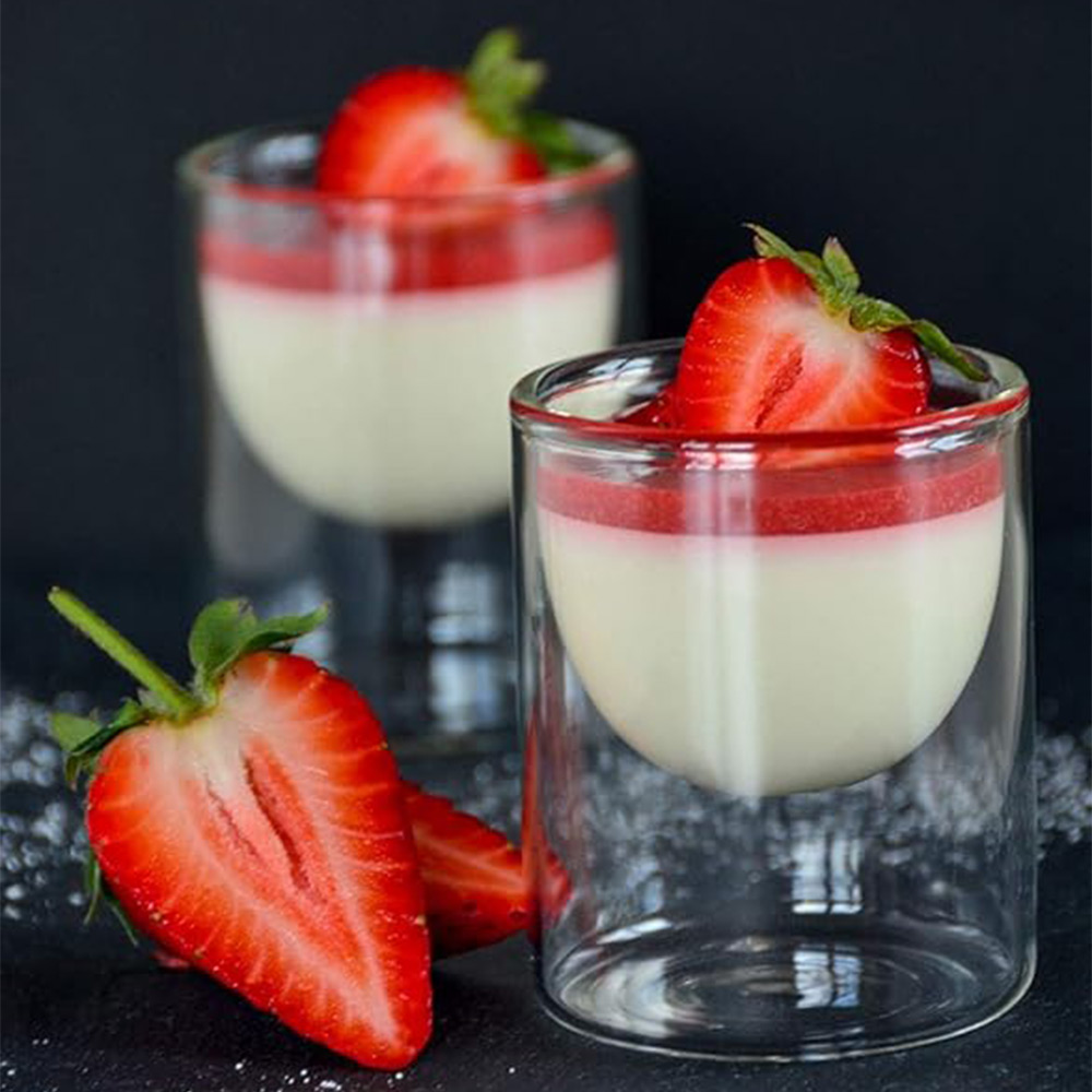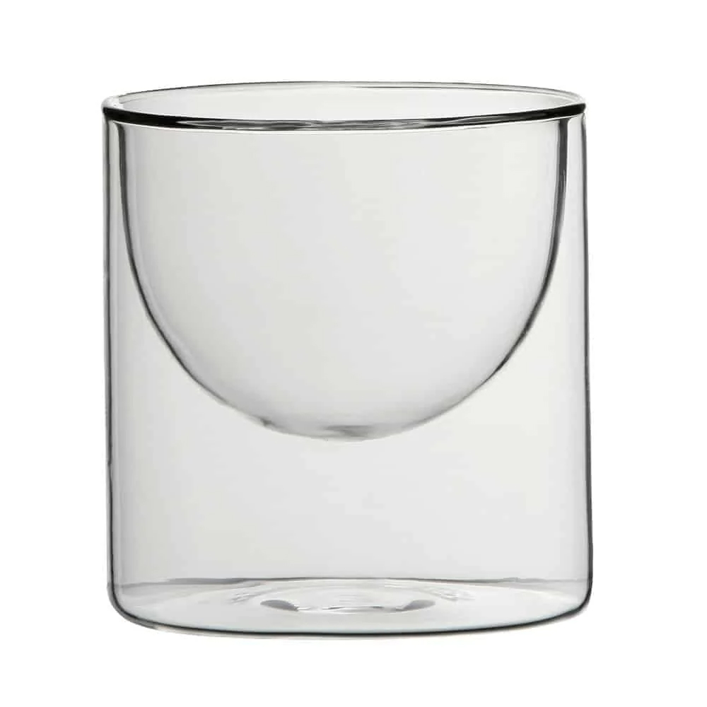 The glass features a unique cylindrical shape . The outer wall of glass is straight and cylindrical while The inner wall of the glass is smaller and has a rounded base with a hint of spherical shape which overall gives it a luxurious and unique look with a floating drink illusion making every sip visually delightful. Its. The base is flat and rounded to ensure stability.