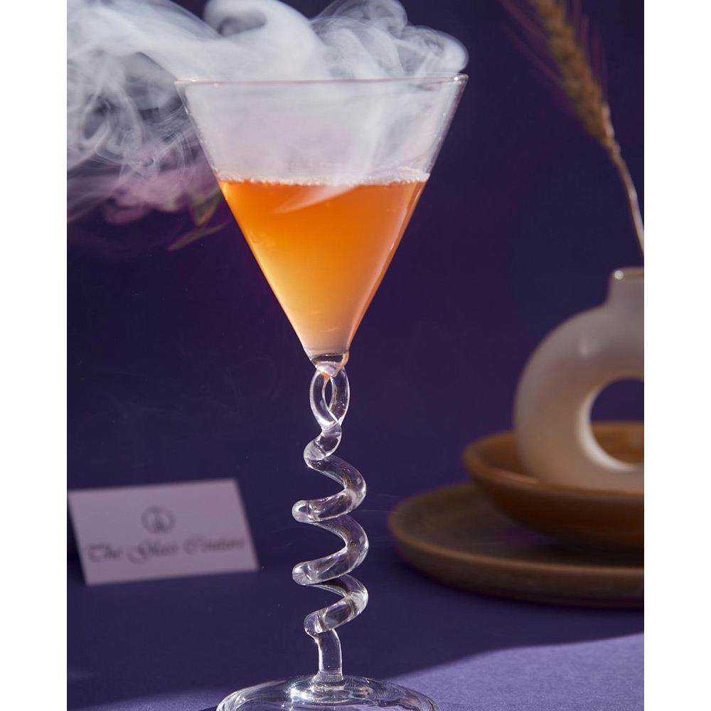 The upper glass is conical in shape making it ideal for mocktails, cocktails like martini, Cosmopolitan, Appletini, Negroni Up, Manhattan or any other drink. Its standout feature is a spiral stem that adds a sophisticated, contemporary touch, catching the eye and elevating its visual appeal.. The clear, cylindrical spiral stem not only enhances the aesthetic but also provides a secure and comfortable grip Resting securely on a sturdy, flat circular base.