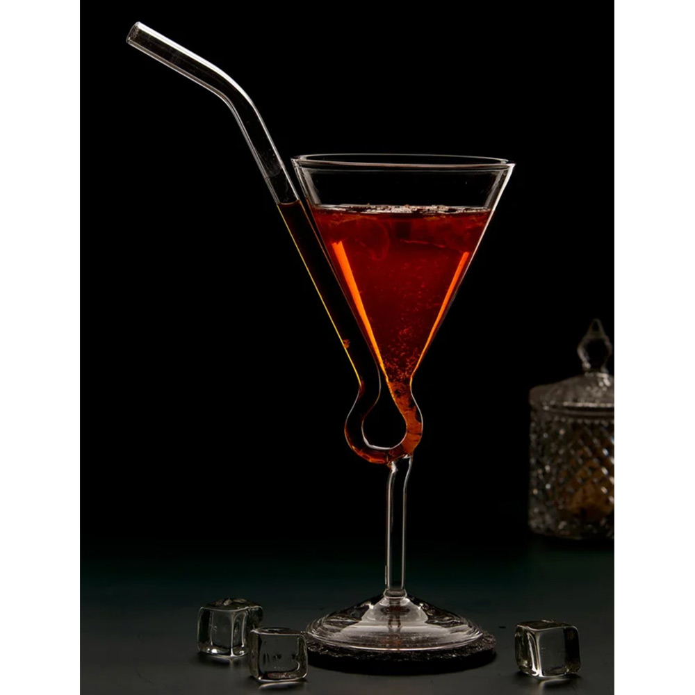 The body of the glass is conical, with a slightly curved loop bottom which extends upward to an extending straw . The Body of glass is attached to a stem and base at bottom which gives it a strong balance, and the rim is flared at the top. From the bottom a curved glass straw extends upward with a bend outwards. This straw allows the drink to be sipped from the bottom, giving a unique drinking experience. The overall look of glass is elegant and artistic, the glass is a perfect fit for sipping any drink. The design not only serves as a functional drinking glass but also adds an aesthetic appeal, making it an elegant and upscale choice.